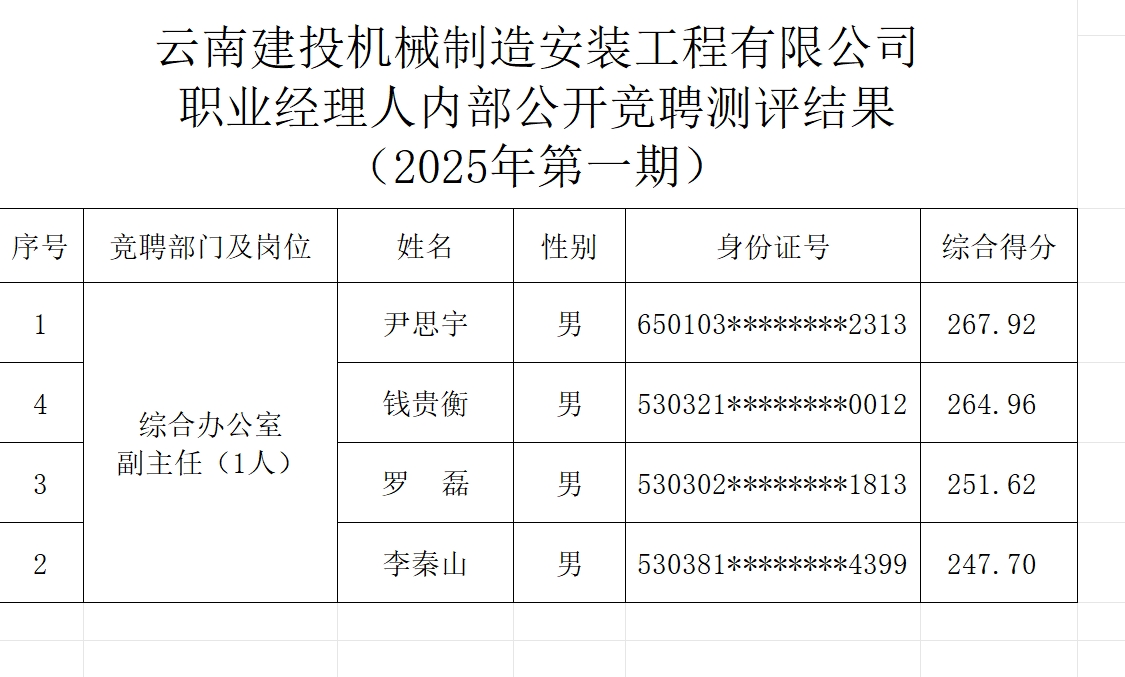 附件:云南建投機械制造安裝工程有限公司職業(yè)經(jīng)理人內(nèi)部公開競聘測評結(jié)果公示(2025年第一期)
